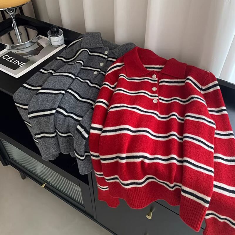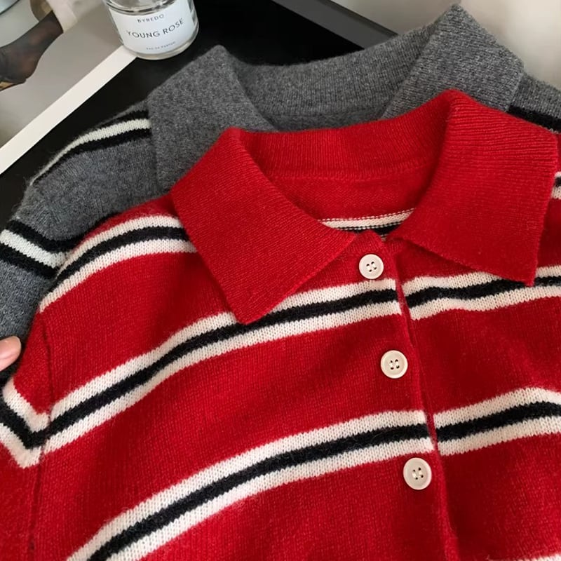 ボーダー柄 長袖 ポロカラー ニットセーター 2color ATO0040