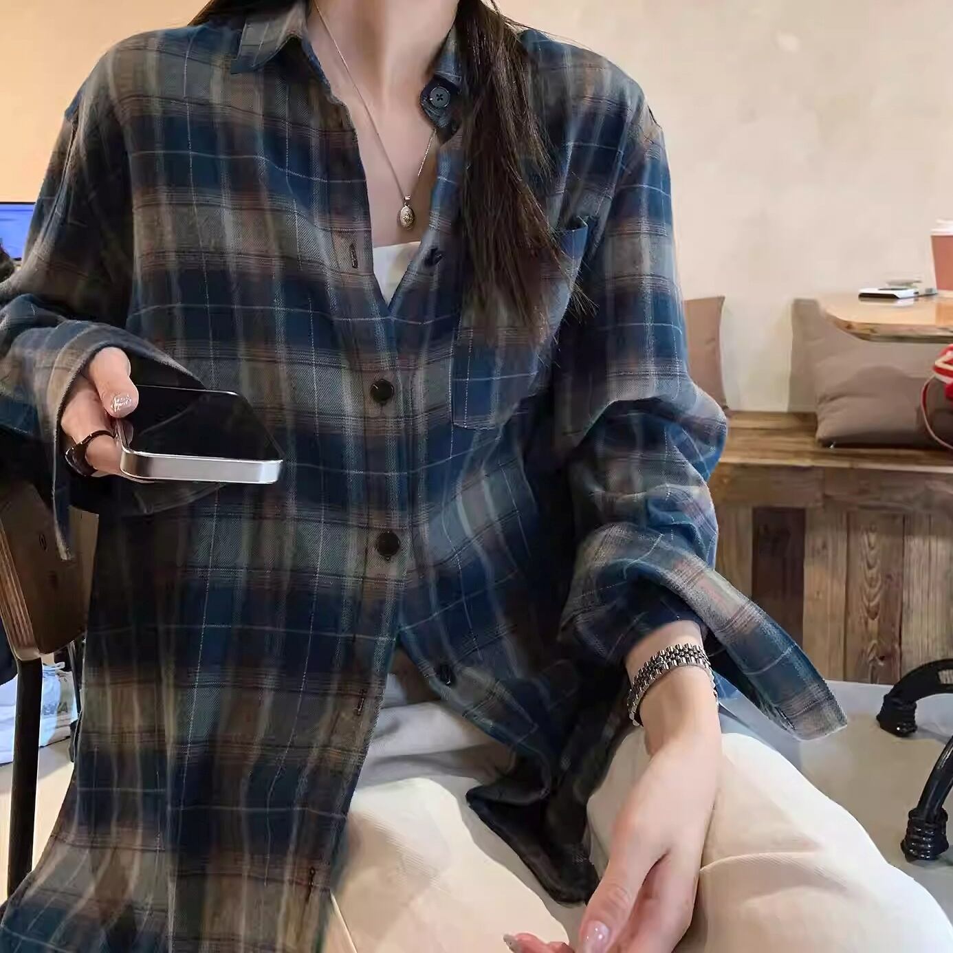 チェック柄 ボタンフロント ヒップ丈 長袖 シャツ 1color ATO0117